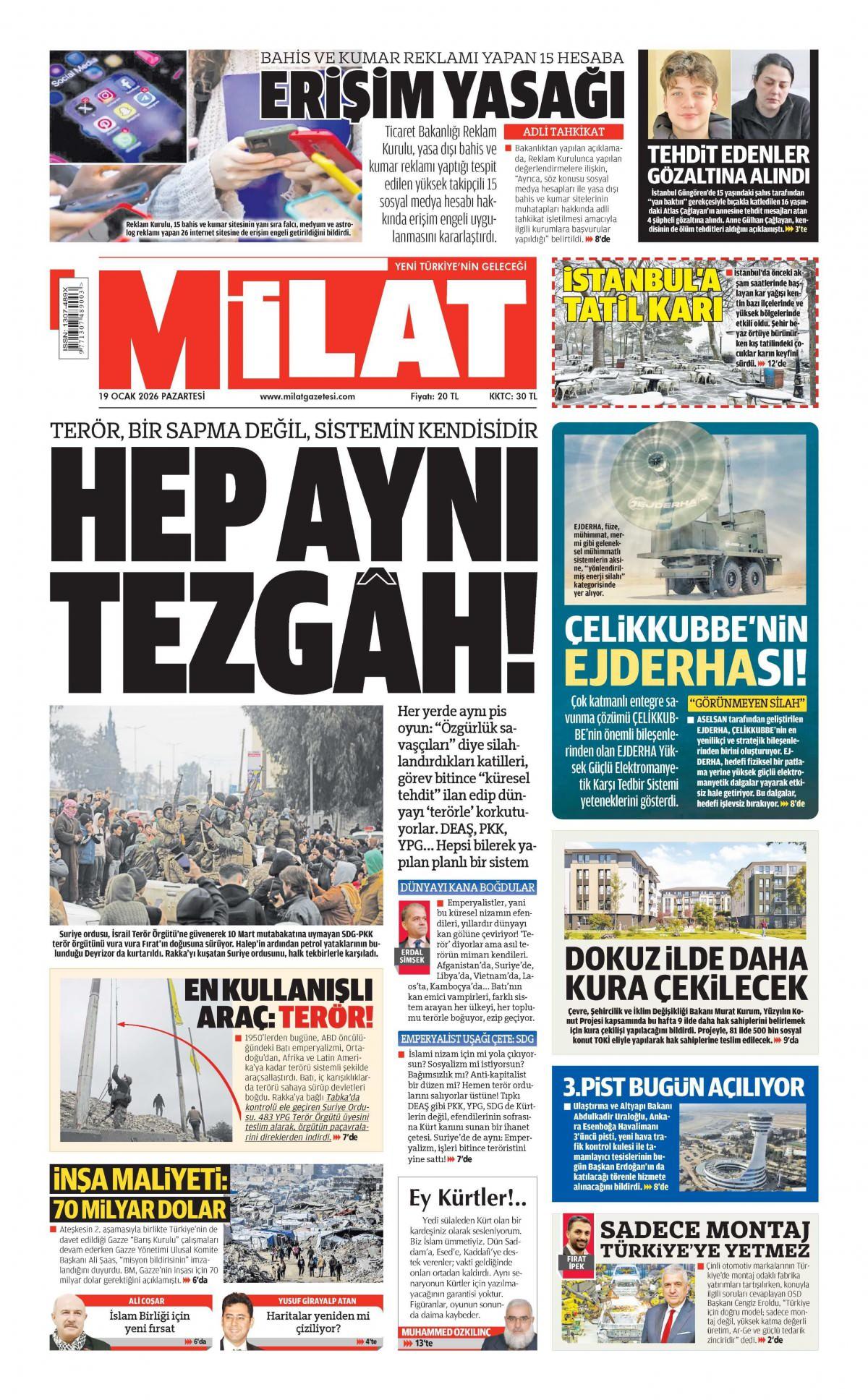 Milat Gazetesi 19 Ocak 2026 Günü Manşeti