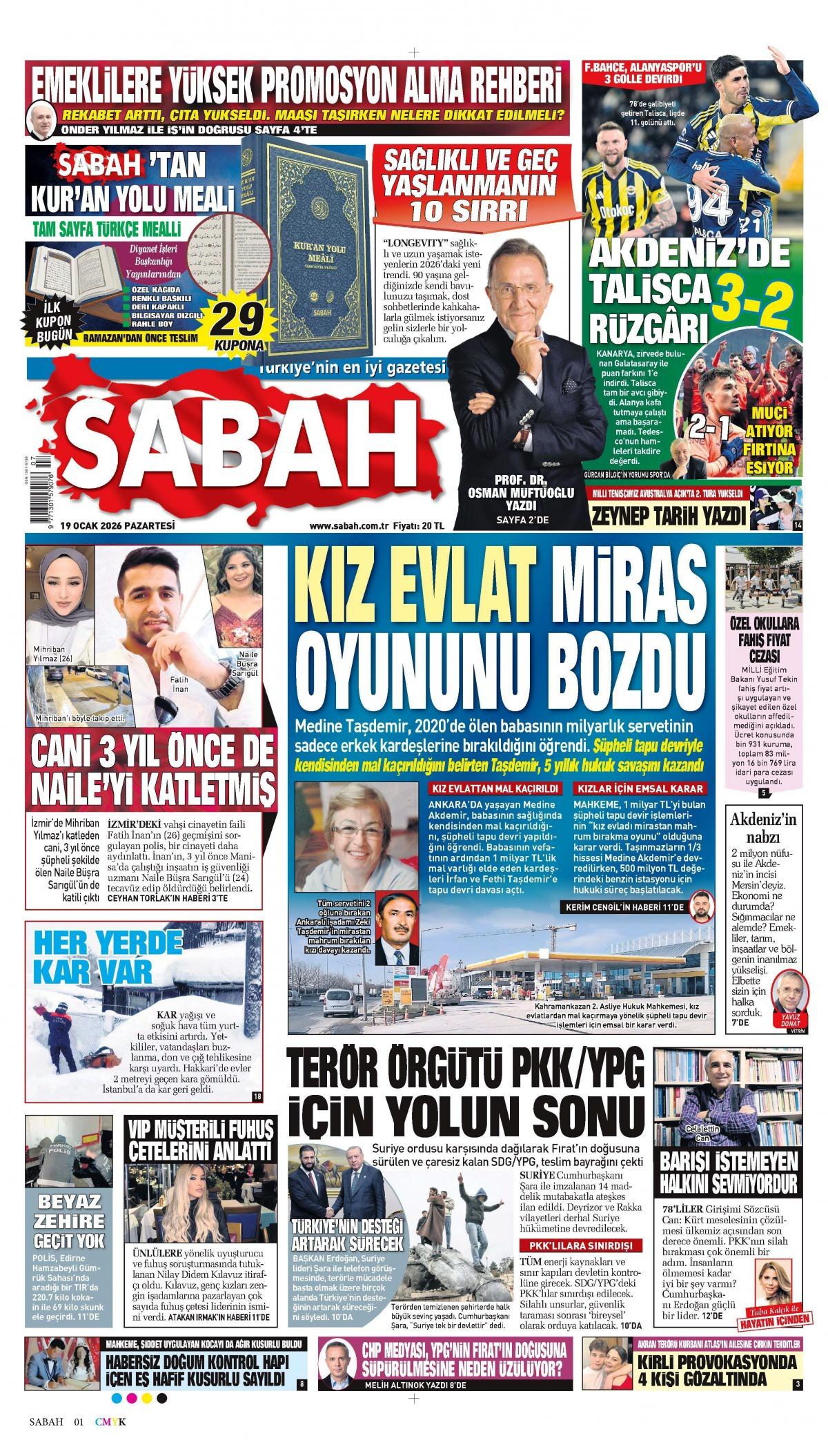 Sabah Gazetesi 19 Ocak 2026 Günü Manşeti