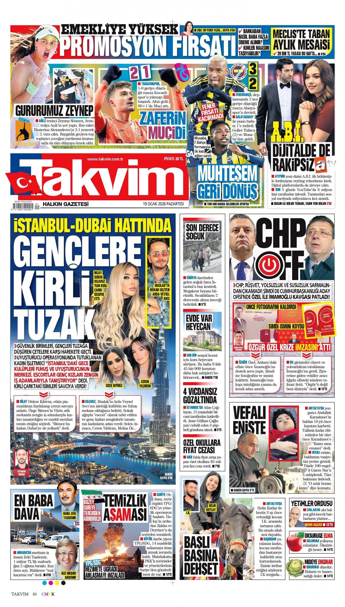 Takvim Gazetesi 19 Ocak 2026 Günü Manşeti