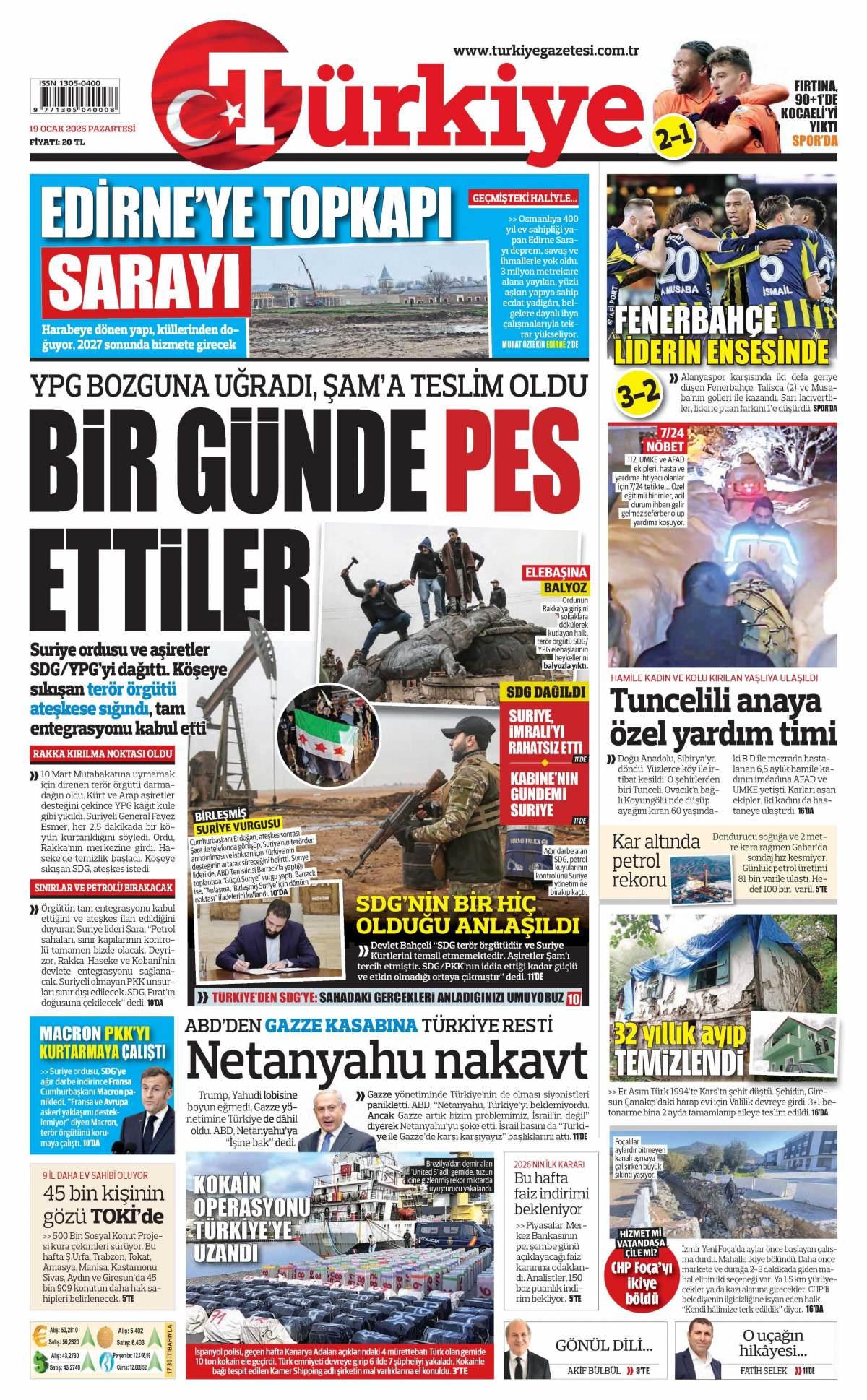 Türkiye Gazetesi 19 Ocak 2026 Günü Manşeti