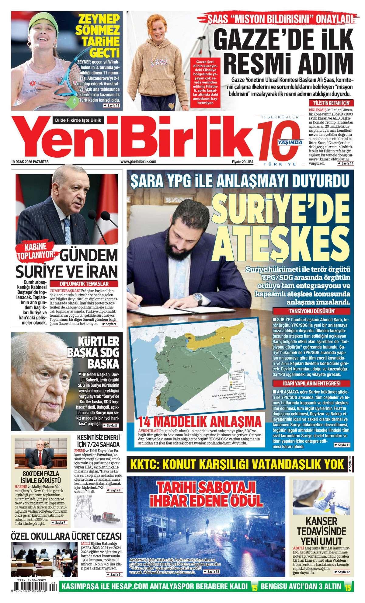 Yeni Birlik Gazetesi 19 Ocak 2026 Günü Manşeti